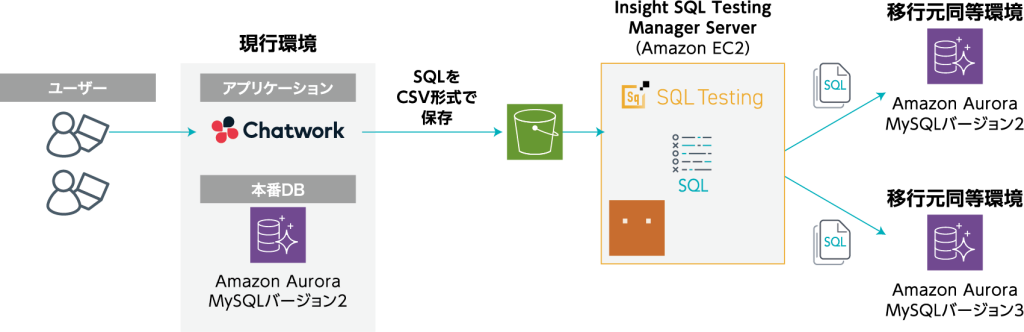 95.3万社以上が導入する日本最大級のビジネスチャット「Chatwork」はkubellの主力事業であり、多くの企業の業務に不可欠なコミュニケーション基盤となっている。「Chatwork」のバックエンドデータベースはAWS上で構築・運用され、日々膨大な量のデータを処理する。今回、旧バージョンのサポート終了を迎え、データベースのAmazon Aurora MySQL バージョン3への移行が喫緊の課題となっていた。長年にわたり機能追加や修正がなされてきた巨大なデータベースを、ユーザーに影響を与えずに、安全かつ確実に移行するためには、網羅的なテストの実施が不可欠であると判断。そこで、人海戦術で半年かけて対応する場合の人件費と比較して安価であることも考慮され、Insight SQL Testingが導入された。