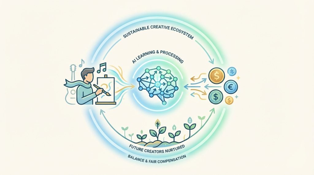 近年AIが生成する「画像」や「音楽」などは、多くの場合、人間のクリエーターが生み出した作品を学習データとして生成されているのは明らかです。もしクリエーター自身がその利用を認めているのであれば問題はありませんが、そうでない場合には、その権利がきちんと守られる仕組みが必要だと強く感じます。