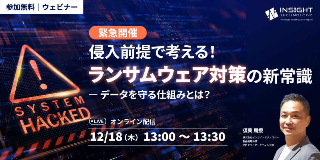 | 30分 | 【緊急開催】侵入前提で考える!ランサムウェア対策の新常識 ― データを守る仕組みとは? 以下の流れでお話します。 はじめに 第1部:ランサムウェアの最新動向と被害の実態 第2部:侵入防御からデータ保護へ ― 攻撃フェーズの理解と対策 第3部:インサイトテクノロジーが提案するデータセキュリティフレームワーク まとめ ![]() 須貝 周授 株式会社インサイトテクノロジー 製品戦略本部 プロダクトマーケティング部 |