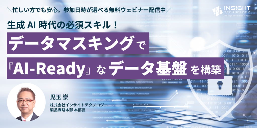 本ウェビナーでは、データマスキング製品Insight Maskingとデータ連携基盤を組み合わせ、データ連携の過程でマスキングを実施することで、データ分析や生成AI活用に安心して利用できる「安全なデータ」をどのように用意するのかを解説します。