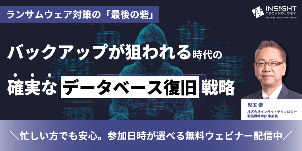 | 30分 | 【ランサムウェア対策の「最後の砦」:バックアップが狙われる時代の確実なデータベース復旧戦略】 ランサムウェア攻撃を受けた際、重要なデータを確実に復旧できる仕組みは整っていますか? 本セミナーでは、ランサムウェア対策においてデータ復旧レイヤーを担う Dbvisit StandbyMP を活用し、万が一の事態でも確実に復旧するための戦略を解説します。 隔離された安全な複製、迅速な切り戻し、復旧テスト機能など、従来型バックアップとの違いをデモを交えてご紹介します。 ![]() 児玉 崇 株式会社インサイトテクノロジー 製品戦略本部 本部長 |