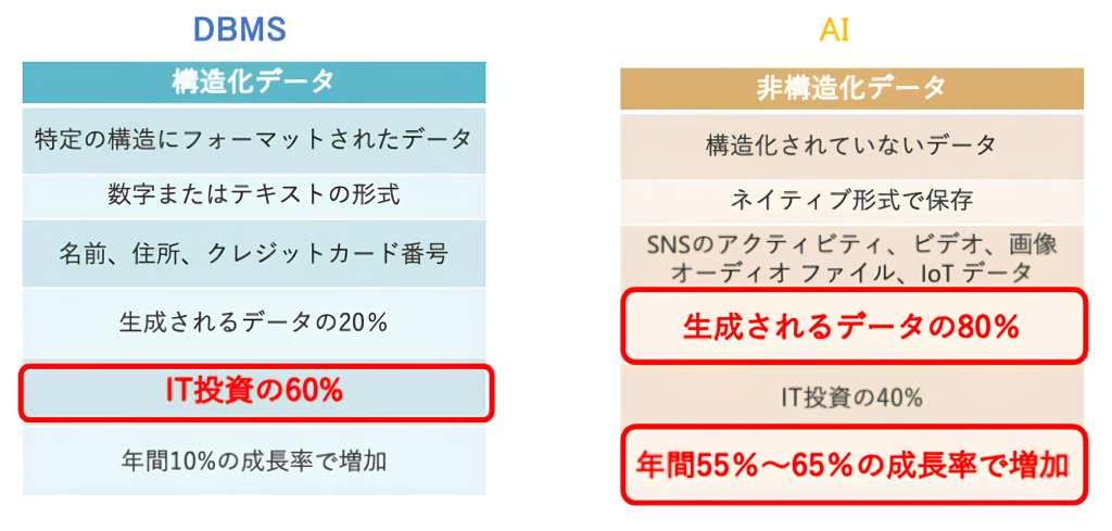 しかし、前述したような整合性やガバナンスといった観点から、データベースが担う役割は依然として非常に大きいままです。特に、金融や流通、通信など社会的に欠かすことのできない重要な役割をデータベースが担っていることから、2020年代に入っても企業のIT投資の60%が構造化データを扱う処理に費やされているとも言われています。とはいえ近年はAIの進化もすさまじく、今までのシステムでは対応できなかった汎用的な役割を担うようになってきたため、その状況にも少し変化が出ています。