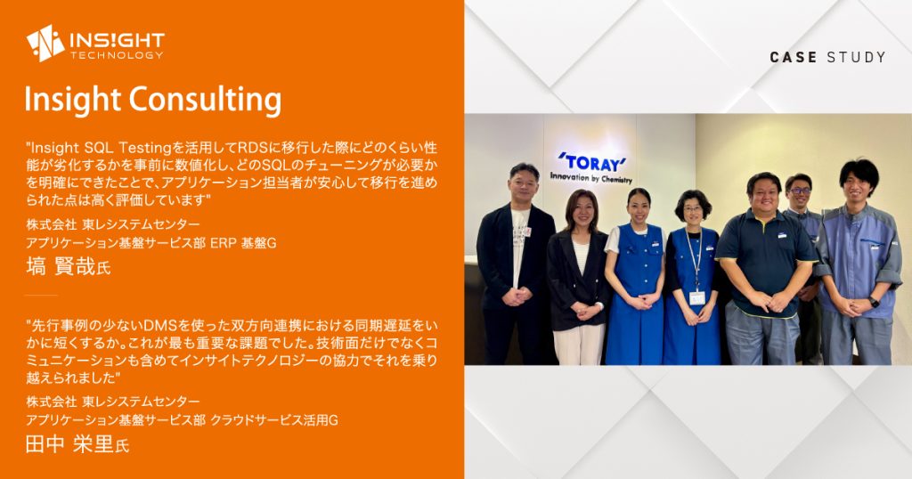 株式会社インサイトテクノロジー(本社所在地:東京都渋谷区、代表取締役社長 CEO:森田 俊哉、以下:インサイトテクノロジー)は、株式会社東レシステムセンター(本社所在地:東京都中央区、代表取締役:河田 輝久、以下、東レシステムセンター)が実施した、基幹システムを含む224の業務アプリケーションを「Oracle Exadata」から「Amazon RDS for Oracle(以下、AWS RDS)」へ移行する大規模プロジェクトにおいて、自社のコンサルティングサービス「Insight Consulting」が採用され、プロジェクト成功を支援したことをお知らせします。