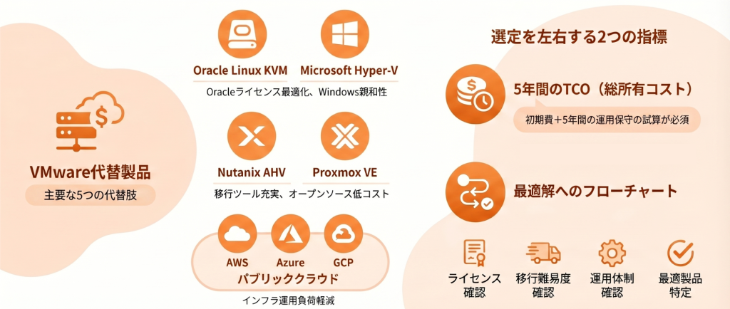 VMwareからの移行先として検討される主要な選択肢は、以下の5つです。