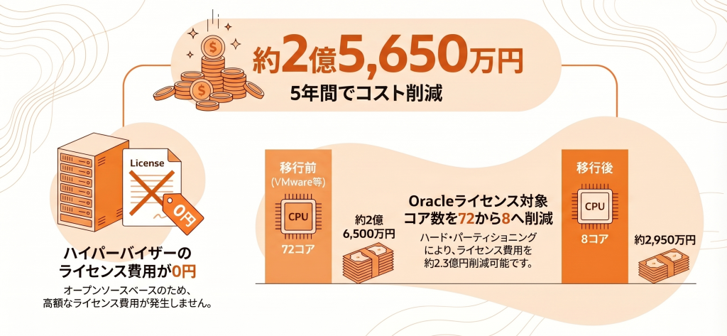 2. Oracleライセンスの大幅削減:Hard Partitioning対応により、ライセンス対象コア数を72コア→8コアに削減。約26,500万円→約2,950万円と、約23,550万円のライセンスコスト削減が実現します。