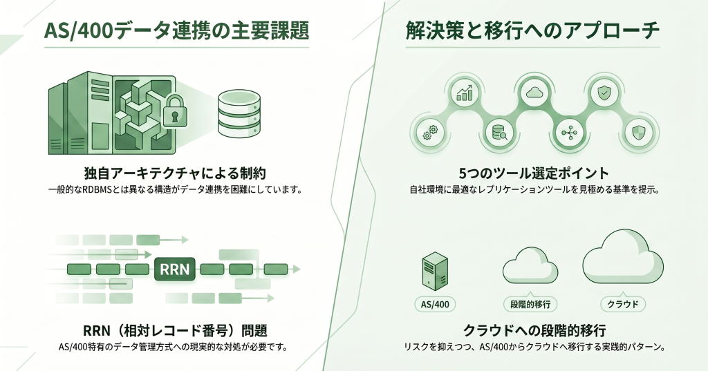 - AS/400は独自のアーキテクチャ(DB2 for i・EBCDIC・ジャーナル)を持ち、一般的なRDBMS向けツールがそのままでは使えないケースがある