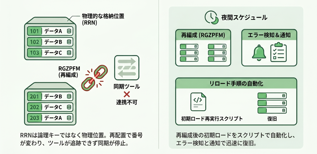 - リロード手順の自動化:再編成後のリロード(初期ロードの再実行)をスクリプト化・自動化し、復旧時間を最小化します。