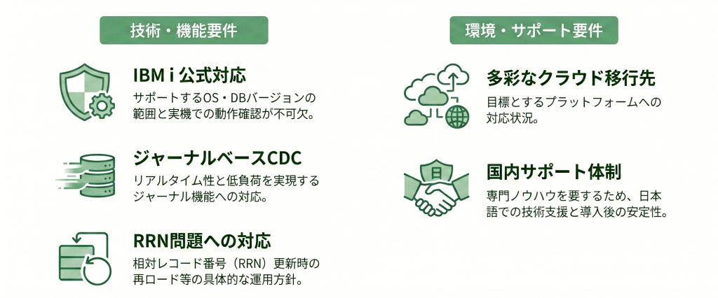 - ツール選定では「IBM i公式対応」「ジャーナルベースCDC」「RRN問題への対応方針」「クラウド移行先対応」「日本語サポート」の5点を確認する
